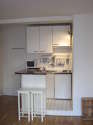 Este apartamento posee una cocina con azulejo en el sueloy todo el equipamiento esencial para su vida diaria : placas eléctricas, refrigerador, micro ondas, congelador, cafetera, estantería, armario empotrado, vajilla, bar.