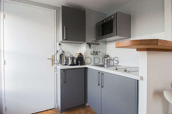 Este apartamento posee una bonito cocina con parquet en el sueloy todo el equipamiento esencial para su vida diaria : placas eléctricas, refrigerador, micro ondas, horno micro-ondas, congelador, tostador, hervidor, cafetera, armario empotrado, vajilla, taburete, bar.