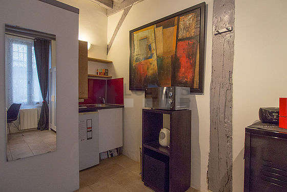 Este apartamento posee una bonito cocina con azulejo en el sueloy todo el equipamiento indispensable para su vida diaria : placas eléctricas, refrigerador, micro ondas, congelador, cafetera, estantería, vajilla.