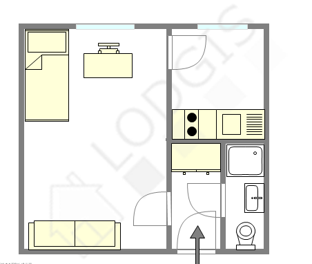 Este apartamento posee una cocina con azulejo en el sueloy todo el equipamiento necesario para su vida diaria : placas eléctricas, refrigerador, horno micro-ondas, congelador, hervidor, cafetera, estantería, armario empotrado, vajilla.