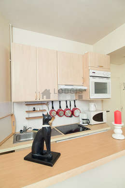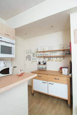 Este apartamento posee una bonito cocina con azulejo en el sueloy todo el equipamiento necesario para su vida diaria : placas eléctricas, refrigerador, horno, micro ondas, congelador, campana extractora, tostador, hervidor, cafetera, estantería, armario empotrado, vajilla, taburete.
