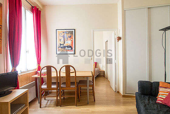 Este apartamento está formado por un salón con parquet en el suelo y ventanas doble acristalamiento. Este salón tranquilo está amueblado y equipado para que su estancia sea agradable : televisor, sábanas, edredones, mesa, ropero, armario empotrado, 4 silla(s)1 sofá cama.