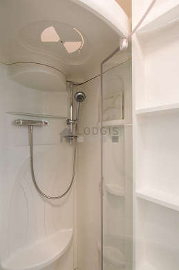 Este apartamento tiene una sala de baño agradable. Este baño tiene todo lo necesario para su bienestar diario : toallas, estantería, armario empotrado, ducha, sink. El WC está separado de la sala del baño y ubicado en un espacio independiente.
