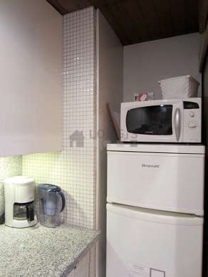 Este apartamento posee una cocina con azulejo en el sueloy todo el equipamiento esencial para su vida diaria : placas eléctricas, refrigerador, congelador, horno, micro ondas, campana extractora, tostador, hervidor, cafetera, estantería, armario empotrado, vajilla.