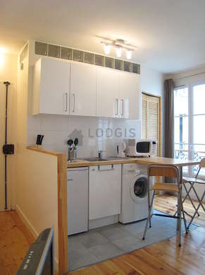 Este apartamento posee una bonito cocina con azulejo en el sueloy todo el equipamiento indispensable para su vida diaria : placas eléctricas, refrigerador, micro ondas, congelador, hervidor, armario empotrado, vajilla, taburete, bar.