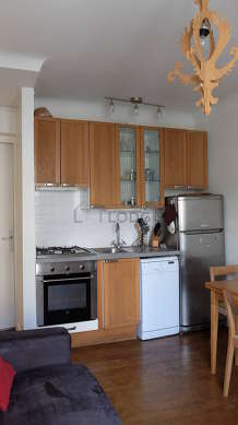 Este apartamento posee una bonito cocina con parquet en el sueloy todo el equipamiento necesario para su vida diaria : placas eléctricas, refrigerador, congelador, horno, tostador, hervidor, cafetera, armario empotrado, vajilla.