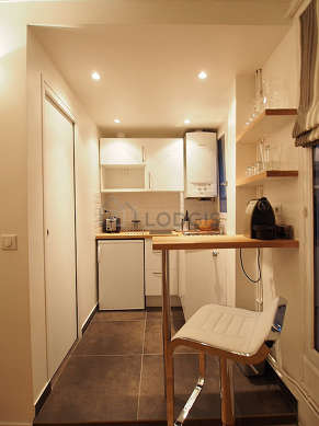 Este apartamento posee una bonito cocina con azulejo en el sueloy todo el equipamiento necesario para su vida diaria : placas eléctricas, refrigerador, horno micro-ondas, congelador, tostador, hervidor, cafetera, armario empotrado, vajilla, taburete, bar.