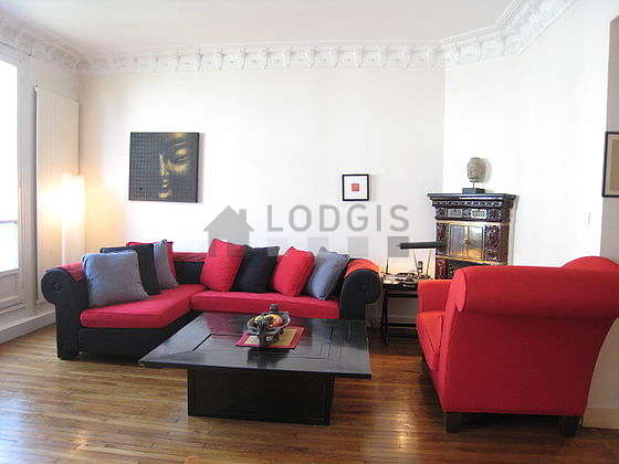 Este apartamento está formado por un salón con parquet en el suelo y ventanas, un balcon y una vista a la calle. Este salón tranquilo está amueblado y equipado para que su estancia sea agradable : sofá, mesa, mesita, estantería, 6 silla(s).