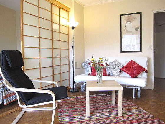 Este apartamento está formado por un salón con parquet en el suelo y ventanas doble acristalamiento, un balcon y una vista a la calle. Este salón tranquilo está amueblado y equipado para que su estancia sea agradable : televisor, 1 sillones, mesa, mesita, estantería, 4 silla(s)1 sofá cama.