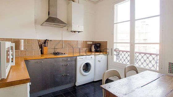 Este apartamento posee una bonito cocina con azulejo en el sueloy todo el equipamiento indispensable para su vida diaria : placas eléctricas, refrigerador, horno micro-ondas, congelador, tostador, hervidor, cafetera, mesa, armario empotrado, 2 silla(s).