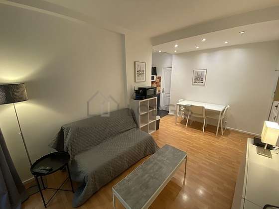 Este apartamento está formado por un salón con parquet en el suelo y ventanas doble acristalamiento y una vista a al patio. Este salón tranquilo está amueblado y equipado para que su estancia sea agradable : televisor, sábanas, edredones, mesita, estantería, aparador, 3 silla(s), taburete1 sofá cama.