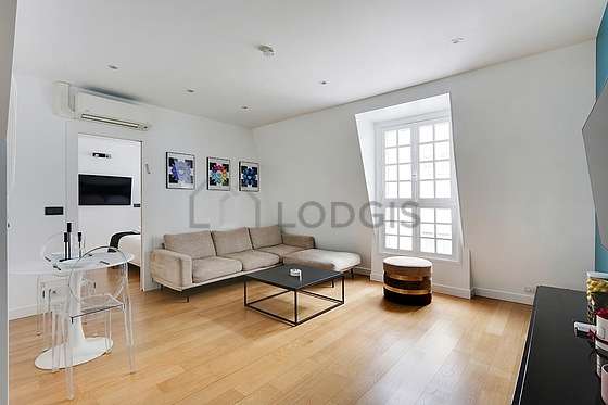 Este apartamento está formado por un salón con parquet en el suelo y ventanas y una vista a al patio. Este salón muy tanquilo está amueblado y equipado para que su estancia sea agradable : televisor, sábanas, edredones, mesa, mesita, mesa de estudio, biblioteca, estantería, cómoda, armario empotrado, 4 silla(s)1 sofá cama.