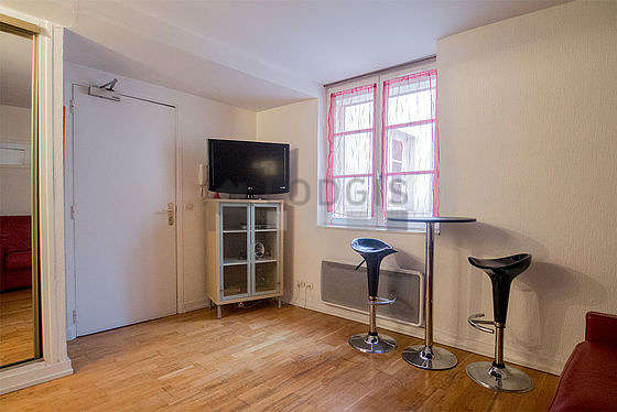 Este apartamento está formado por un salón con parquet en el suelo y ventanas doble acristalamiento y una vista a al patio. Este salón tranquilo está amueblado y equipado para que su estancia sea agradable : televisor, sábanas, edredones, mesa, ropero, estantería, cómoda, armario empotrado, taburete1 sofá cama.