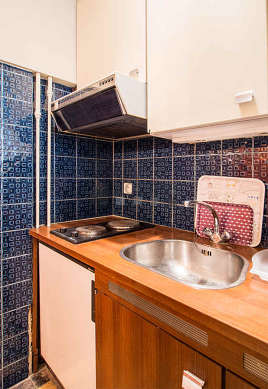 Este apartamento posee una cocina con azulejo en el sueloy todo el equipamiento indispensable para su vida diaria : placas eléctricas, refrigerador, micro ondas, congelador, campana extractora, tostador, hervidor, cafetera, estantería, armario empotrado, vajilla.