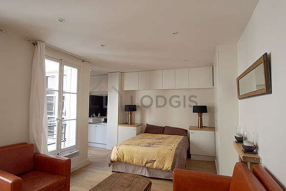 Este apartamento está formado por un salón con parquet en el suelo y ventanas y una vista a al patio. Este salón tranquilo está amueblado y equipado para que su estancia sea agradable : televisor, sábanas, edredones, 2 sillones, mesita, ropero, estantería, armario empotrado, mesita de noche1 cama.