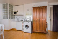 Este apartamento posee una cocina con parquet en el sueloy todo el equipamiento indispensable para su vida diaria : placas eléctricas, refrigerador, micro ondas, congelador, hervidor, cafetera, armario empotrado, vajilla.