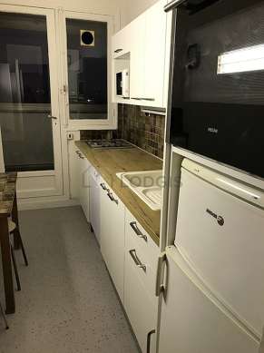 Este apartamento posee una cocina con azulejo en el sueloy todo el equipamiento necesario para su vida diaria : placas eléctricas, refrigerador, horno, micro ondas, cafetera, mesa, armario empotrado, vajilla, 1 silla(s), taburete.