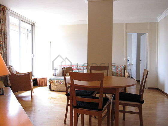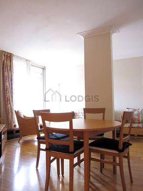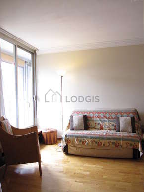 Este apartamento está formado por un salón con parquet en el suelo y ventanas, un balcon y una vista a jardín. Este salón tranquilo está amueblado y equipado para que su estancia sea agradable : televisor, 1 sillones, mesa, mesita, cómoda, 4 silla(s)1 sofá cama.