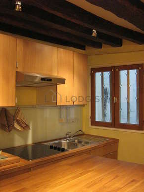 Este apartamento posee una bonito cocina con coco en el sueloy todo el equipamiento indispensable para su vida diaria : placas eléctricas, refrigerador, congelador, horno micro-ondas, campana extractora, tostador, cafetera, estantería, armario empotrado, vajilla, taburete, bar.