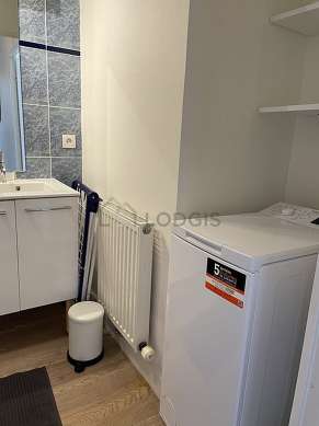 Este apartamento tiene una sala de baño agradable. Este baño tiene todo lo necesario para su bienestar diario : estantería, bañera, airer, sink, mirror, coat stand, towel rack, carpet. El WC está separado de la sala del baño y ubicado en un espacio independiente.