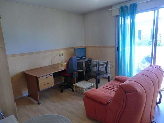 Este apartamento está formado por un salón ventanas. Este salón está amueblado y equipado para que su estancia sea agradable : sofá, mesita, mesa de estudio, 1 silla(s).