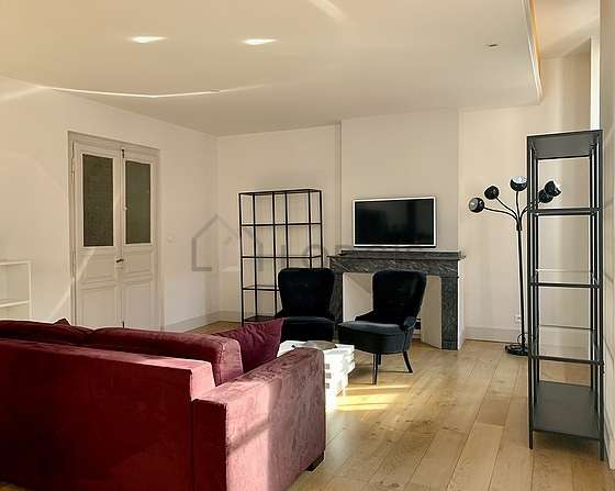 SalónEste apartamento está formado por un salón con parquet en el suelo una vista a la calle. Este salón tranquilo está amueblado y equipado para que su estancia sea agradable : televisor, sofá, mesita, biblioteca, estantería1 sofá cama.