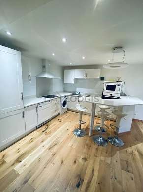 Este apartamento posee una cocina contiguo al salóny todo el equipamiento esencial para su vida diaria : placas eléctricas, refrigerador, horno, micro ondas, congelador, campana extractora, hervidor, cafetera, estantería, armario empotrado, vajilla, taburete, bar.