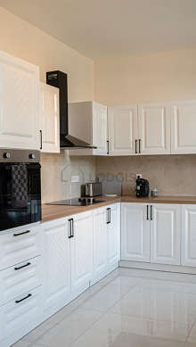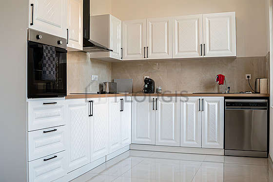 Cet appartement dispose d'une cuisine avec du carrelage au sol et tout l'équipement indispensable pour votre quotidien : plaques de cuisson, grille pain, bouilloire électrique, cafetière, placard.