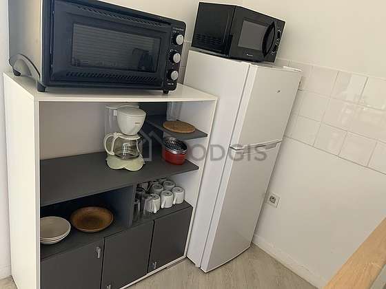Cet appartement dispose d'une magnifique cuisine avec du parquet au sol et tout l'équipement nécessaire pour votre quotidien : plaques de cuisson, réfrigerateur, congélateur, four, micro ondes, cafetière, placard, vaisselle, poubelle.