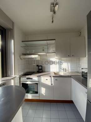 Cet appartement dispose d'une belle cuisine avec du carrelage au sol et tout l'équipement nécessaire pour votre quotidien : plaques de cuisson, réfrigerateur, congélateur, four, micro ondes, hotte, etagère, placard, vaisselle, bar.