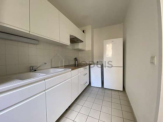 Cet appartement dispose d'une cuisine avec du carrelage au sol et tout l'équipement essentiel pour votre quotidien : plaques de cuisson, réfrigerateur, four, micro ondes, cafetière, vaisselle.