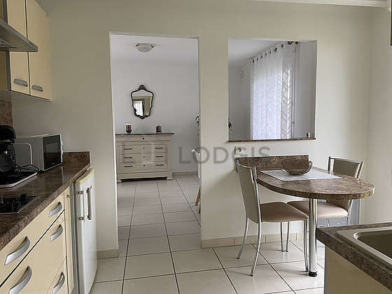Cet appartement dispose d'une magnifique cuisine avec du carrelage au sol et tout l'équipement indispensable pour votre quotidien : plaques de cuisson, réfrigerateur, table à manger, placard, vaisselle, 1 chaise(s).