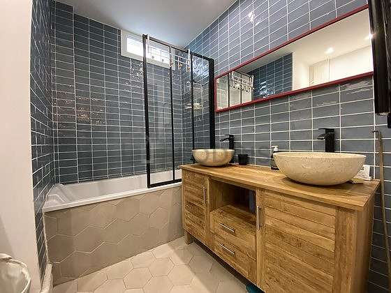 Cet appartement est équipé d'une salle de bain agréable et très claire. Cette salle d'eau bénéficie du nécessaire pour votre bien-être au quotidien : etagère, placard, baignoire, lavabo, radiateur sèche-serviettes. Les toilettes sont séparées de la salle de bain et situées dans une pièce indépendante.