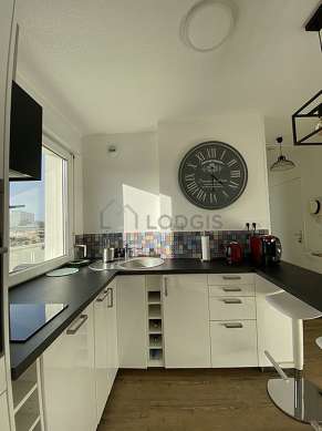Cet appartement dispose d'une cuisine avec du parquet au sol et tout l'équipement essentiel pour votre quotidien : plaques de cuisson, réfrigerateur, congélateur, micro onde combiné, hotte, bouilloire électrique, cafetière, vaisselle, tabouret.