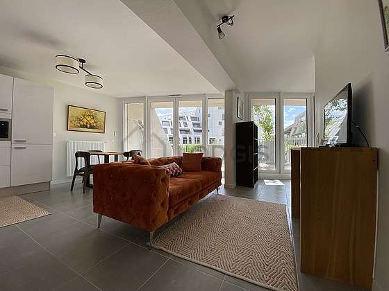 Cet appartement est composé d'un magnifique salon avec du carrelage au sol et des fenêtres double vitrage et vue sur jardin. Ce salon très calme est meublé et équipé pour rendre votre séjour agréable : télé, canapé, 1 fauteuil(s), table basse, bureau, bibliothèque.