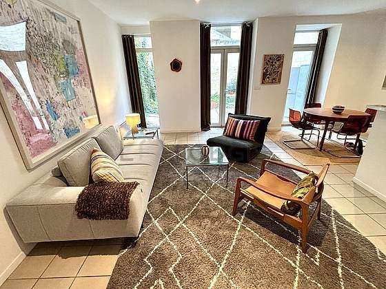 Cet appartement est composé d'un salon avec du carrelage au sol et des fenêtres. Ce salon est meublé et équipé pour rendre votre séjour agréable : canapé, table à manger, 1 chaise(s).