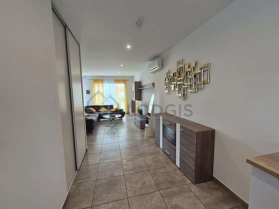 Cette maison individuelle est composée d'un superbe salon avec du carrelage au sol et des fenêtres. Ce salon très calme est meublé et équipé pour rendre votre séjour agréable : télé, canapé, table basse, placard.