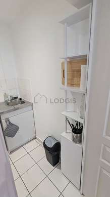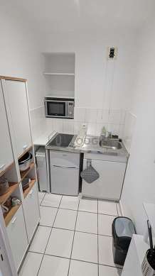 Cet appartement dispose d'une magnifique cuisine avec du carrelage au sol et tout l'équipement indispensable pour votre quotidien : plaques de cuisson, réfrigerateur, micro ondes, placard.