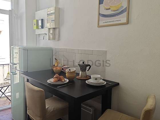 Cet appartement dispose d'une cuisine avec de la tomettes au sol et tout l'équipement essentiel pour votre quotidien : réfrigerateur, four, table à manger, tabouret.
