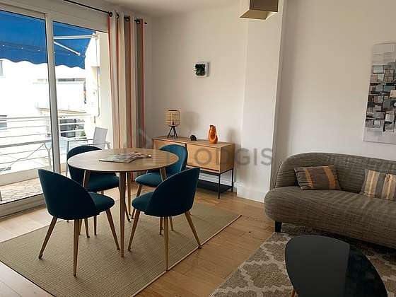 Cet appartement est composé d'un charmant salon avec du parquet au sol et des fenêtres. Ce salon calme est meublé et équipé pour rendre votre séjour agréable : télé, canapé, table basse, 1 chaise(s).