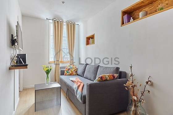 SéjourCet appartement est composé d'un salon avec du carrelage au sol et des fenêtres double vitrage. Ce salon est meublé et équipé pour rendre votre séjour agréable : télé, fer à repasser, canapé, 1 chaise(s), console, miroir, tableau, vase.