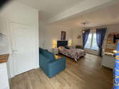 Cet appartement est composé d'un salon avec du parquet au sol et des fenêtres. Ce salon est meublé et équipé pour rendre votre séjour agréable : télé, canapé, bureau, 1 chaise(s)1 lit(s) de 140cm.