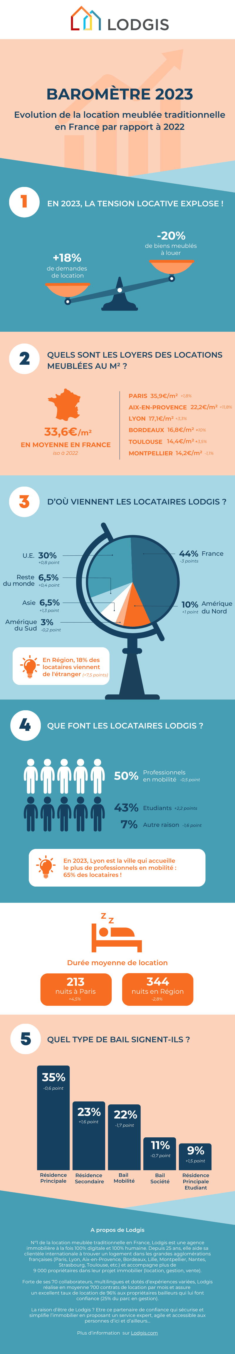 Lodgis dresse un état des lieux du marché de la location meublée traditionnelle pour l’année 2023 à Paris, Lyon, Toulouse, Aix-en-Provence, Montpellier et Bordeaux. Profils des locataires des différentes villes, faits marquants, tendances, le leader français de la location meublée traditionnelle dévoile ses chiffres.