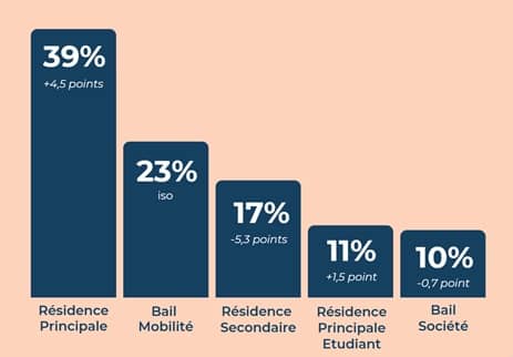 En toute logique, les locataires ont signé davantage de baux de résidence principale et de résidence principale étudiante (respectivement + 4,5 points et + 1,5 point en moyenne en France en 2024 par rapport à 2023). Cette tendance s’inscrit dans la logique de la hausse des durées de location, conséquence directe de la tension locative et des difficultés à l’achat immobilier.