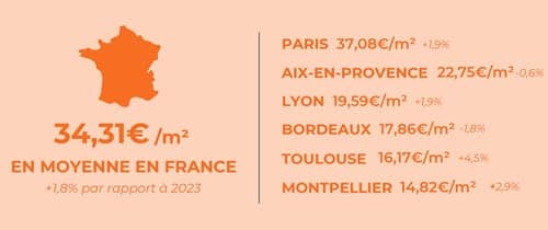 Lodgis note une hausse uniforme des loyers en France : + 1,8 % en 2024 (le loyer est de 34,31 € par m2 par mois en moyenne). Dans le détail, la hausse est de + 1,9 % en Ile-de-France (le loyer est de 37,77 € par m2 par mois en moyenne) et de + 1,7 % en région (le loyer est de 22,60 € par m2 par mois en moyenne). Cette hausse se confirme partout en France selon l’IRL (+ 1,82 % par rapport au quatrième trimestre 2023).