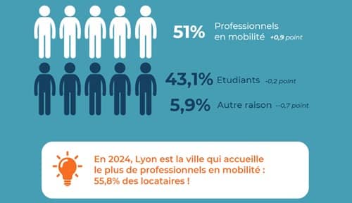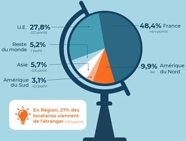La part de professionnels locataires a augmenté en 2024 : + 0,9 point en moyenne en France par rapport à 2023. Au contraire, la part d’étudiants est en légère baisse : - 0,2 point en moyenne en France par rapport à 2023.
