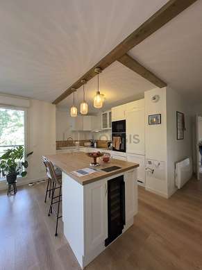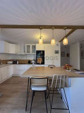 Cet appartement dispose d'une cuisine avec du parquet au sol et tout l'équipement essentiel pour votre quotidien : plaques de cuisson, réfrigerateur, congélateur, table à manger, placard, vaisselle, tabouret.