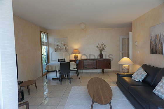 SéjourCet appartement est composé d'un beau salon avec du carrelage au sol et des fenêtres double vitrage avec balcon. Ce salon très calme est meublé et équipé pour rendre votre séjour agréable : télé, canapé, 1 fauteuil(s), table à manger, buffet, vaisselle, 1 chaise(s), tabouret, lampadaire sur pied, meuble tv, tableau, table gigogne, tapis.