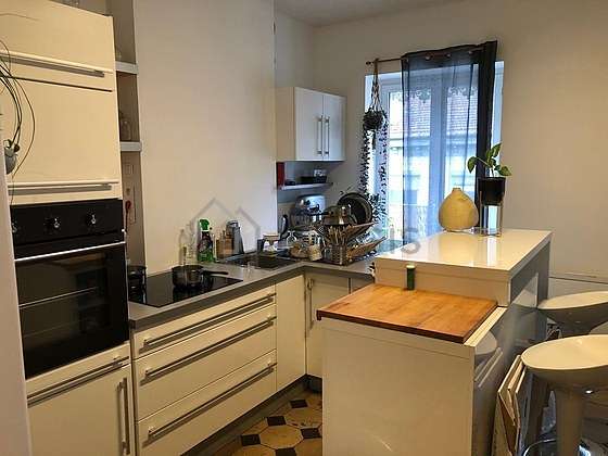 Cet appartement dispose d'une cuisine et tout l'équipement nécessaire pour votre quotidien : plaques de cuisson, réfrigerateur, congélateur, four, placard, vaisselle, tabouret.