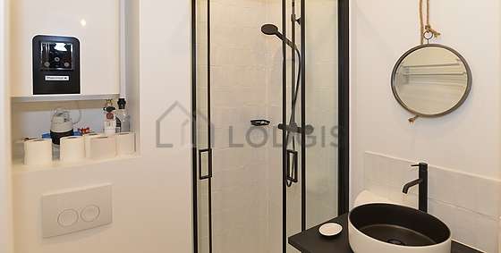 Cet appartement est équipé d'une salle de bain. Cette salle d'eau bénéficie du nécessaire pour votre bien-être au quotidien : serviettes de bain, sèche cheveux, lave main, radiateur sèche-serviettes. Les toilettes sont intégrées dans la salle de bain.